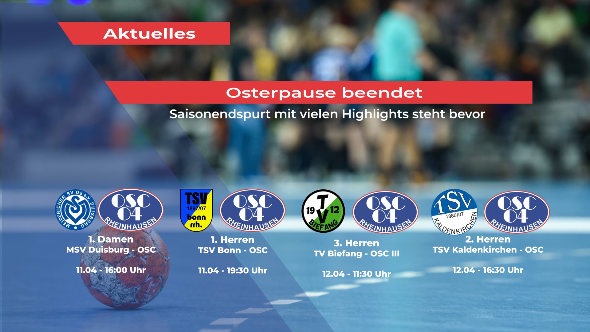 Beide Teams bestreiten im April und Mai jeweils noch drei Heimspiele. Unsere erste Mannschaft trifft dabei auf Gelpe-Strombach, Unitas Haan und den VfL Gummersbach II. Auswärts stehen noch Spiele in Aachen sowie am vorletzten Spieltag in Dormagen an.